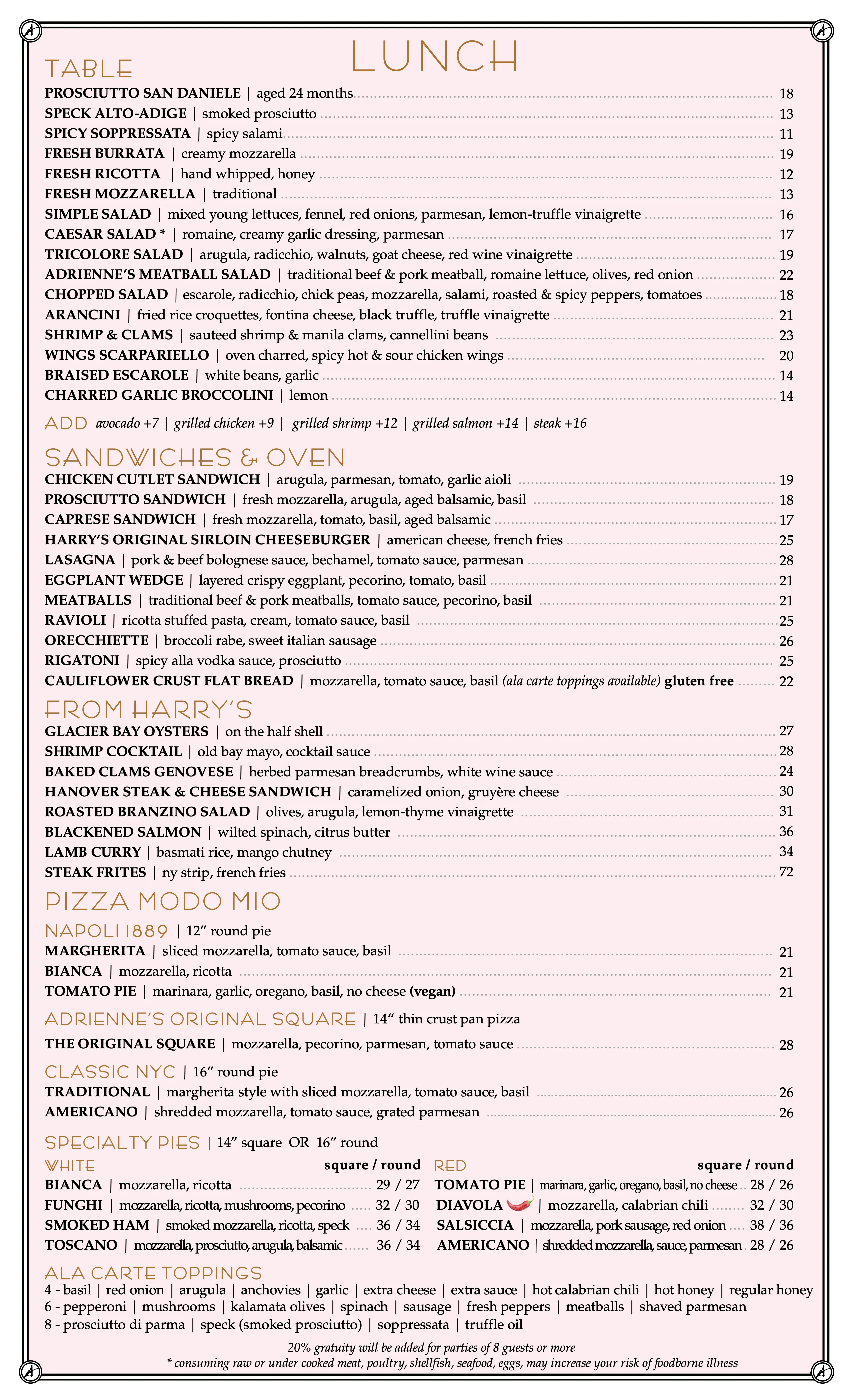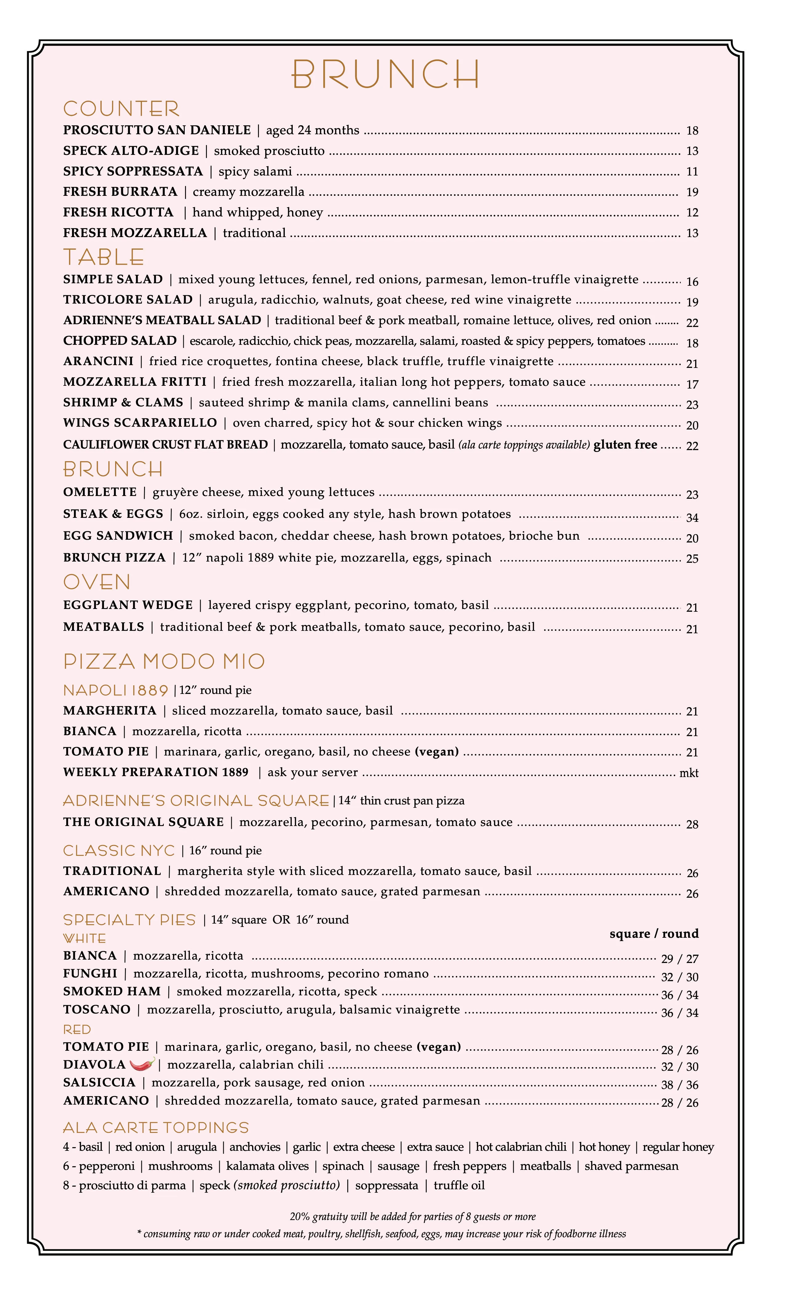 Adrienne’s Pizzabar welcomes you with our stunning 60-foot quartzite bar and pizza counter, soaring ceilings, a massive 9 screen matrix tv, and approachable open dining area. Try our Pizza Modo Mio or "pizza my way" and choose from the famed Adrienne’s Original Sicilian, Adrienne’s Napoli 1889, and Adrienne’s Classic NYC Round.
